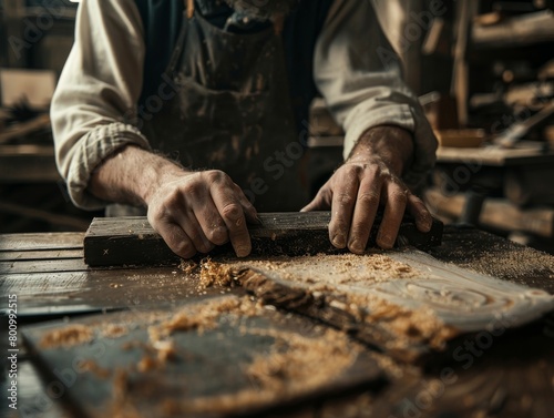 A close-up carpenter's hands planes a wooden board in his workshop.