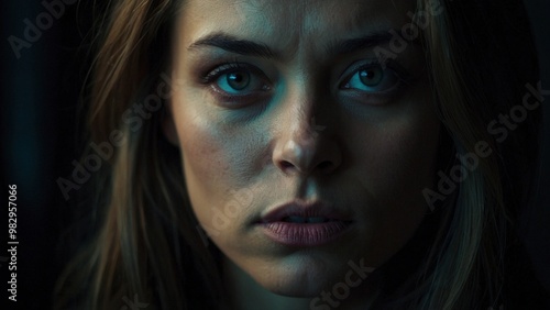 A close-up expressive studio photo portrait of an attractive worried pensive blue eyed young woman looking straight at the camera standing against dark black background.
