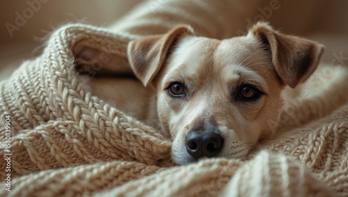 A closeup image of a male Jack Russell Terrier's wool-knit sweater texture, emphasizing its warm craftsmanship.