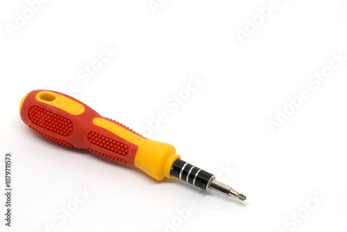 isolated white, construction, maintenance, closeup, hardware, repair, steel, isolated, yellow, industry, instrument, red, fix, white, rubber, screw, hand, grip, work, workshop, metal, equipment, screwdriver, handle, metallic, tool, industrial, plastic, background, object, small, electrician, bricolage, men at work, case