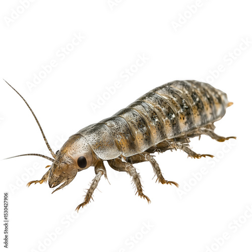 A close-up image of a silverfish insect showcasing its segmented body, long antennae, and multiple legs in fine detail. Png, Transparent background.