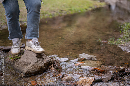 A close-up image of an adventure woman crossing a small nature canal while hiking on the mountain.