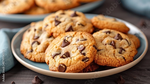 A close-up image of freshly baked chocolate chip cookies arranged on a plate, offering an appealing view of their golden-brown texture and generous chocolate chunks, perfect for dessert lovers.