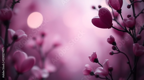 A close-up image shows blurred, pink floral and heart shapes. Soft lighting and bokeh create a dreamy, romantic feel, like a Valentine's Day background.