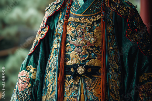 robe, chinese, embroidery, silk, traditional, garment, culture, heritage, ornate, gold, red, blue, teal, floral, pattern, intricate, closeup, detail, history, ceremonial, costume, textile, fabric, art, craftsmanship, asian, imperial, dynasty, aesthetic, luxurious, visual, fashion, artful, texture, vintage