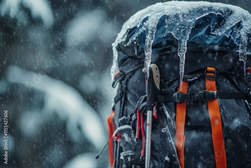A close-up of a backpack against a snow-laden forest backdrop, showcasing the beauty and tranquility of a snowy landscape during a winter snowfall.
