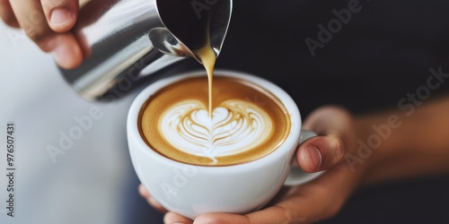 A close-up of a barista pouring milk into a cup of coffee to create a beautiful, intricate design on the latte's surface, highlighting the artistry and skill in coffee making.