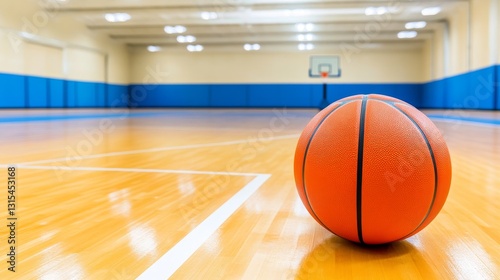 A close-up of a basketball resting on a polished court floor in an empty gymnasium