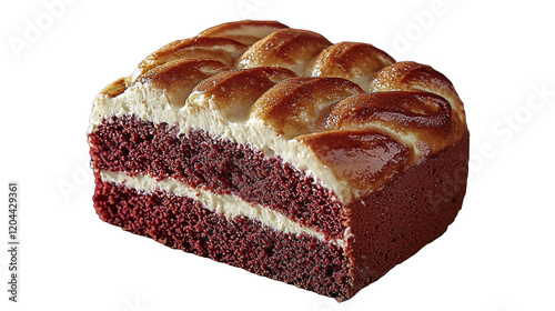 A close-up of a beautiful slice of red velvet cake, showcasing its layers of fluffy cream cheese frosting and rich red sponge. Perfect for dessert lovers.