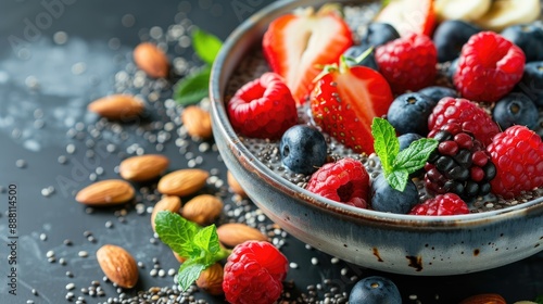 A close-up of a bowl of chia pudding with fresh berries and nuts, highlighting a healthy dessert