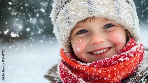 A close-up of a Caucasian child playing in the snow, bundled up in a winter coat and scarf, with a playful smile