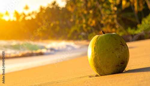 A close-up of a coconut on a sandy beach with the ocean and sun in the background.
