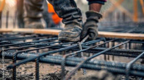 closeup, of, construction, men at work, securing, rebar, wire, tie, concrete, slab, being, prepared, in, background, looking, at, camera, installation, scene, structural, integrity, style, photo, capturing, meticulous, work, technical, expertise, high, quality, image, sharpened, reinforced, structure