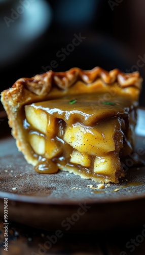 A close-up of a delicious slice of apple pie with a flaky crust and a rich caramel sauce, perfect for a cozy dessert.