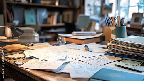 A close-up of a desk with organized notes, charts, and tools for classification.