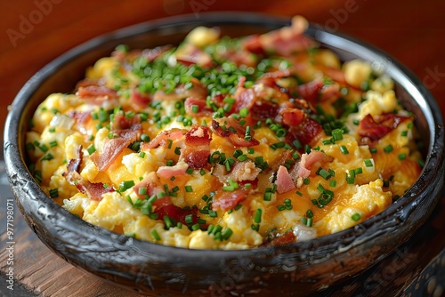 A close-up of a dish of scrambled eggs with bacon and chives. This image is perfect for illustrating a recipe for a breakfast dish.