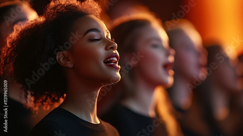choir, closeup, diverse, singer, emotion, harmony, beam, light, blurred, orchestra, background, vibrant, colours, expression, cinematic, realism, passionate, artistic, cultural, oneness, performance, musical, glowing, photorealistic, inclusive, captivating, dramatic, radiant, beautiful, intricate, inspiring, dynamic, atmospheric, connection, melodic, heartfelt, diversity, lively