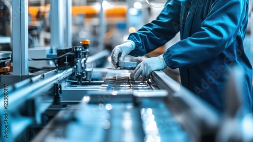 A close-up of a factory worker in protective gear inspecting automated packaging machinery on a production line, Packaging facility scene, Industrial automation style