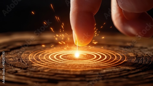 A close-up of a finger touching wood, creating a glowing effect with sparks and concentric circles, symbolizing energy and creativity.