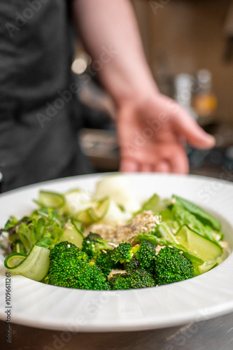 A close-up of a fresh green salad with broccoli, lettuce, and cucumber slices on a white plate. A person in an apron is serving the dish, suggesting a culinary or restaurant setting