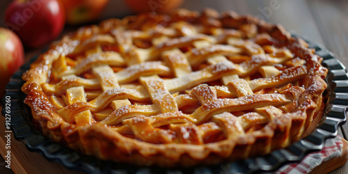 A close-up of a freshly baked apple pie with a golden-brown lattice crust, surrounded by apples, perfect for dessert.