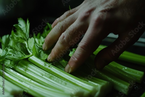 A close-up of a hand arranging fresh celery on a dark surface, highlighting freshness, simplicity, and the art of food preparation and presentation.