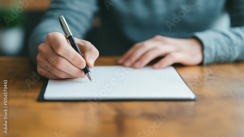 A close-up of a hand holding a pen, writing on a blank sheet of paper, capturing creativity and focus in a serene workspace.
