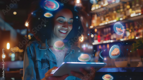 A close-up of a happy and smiling black woman is holding and looking at a tablet with virtual hologram graphic icons of foods above, with a blurred restaurant at night background.