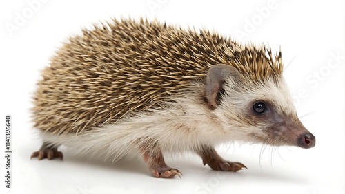 A close-up of a hedgehog on a white background, showcasing its brown spines, small eyes, and soft belly for a clean, simple look
