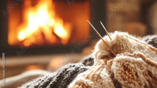 A close-up of a knitting project in progress with needles and yarn beside a cozy fireplace creating a warm and inviting atmosphere
