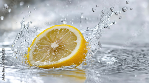 A close-up of a lemon slice splashing into sparkling water, with bubbles rising and droplets flying, evoking a sense of refreshment and zest --chaos