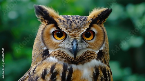 A close-up of a majestic owl with striking orange eyes and detailed feathers.