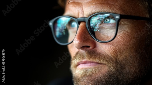 A close-up of a man with stylish glasses, his face partially shadowed, the lenses reflecting a digital display, giving a futuristic feel to the image.