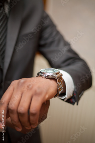 A close-up of a man's wrist as he checks the time on a sophisticated wristwatch, the symbol of punctuality and professionalism. He is dressed in a sharp suit with a crisp white shirt and a dark