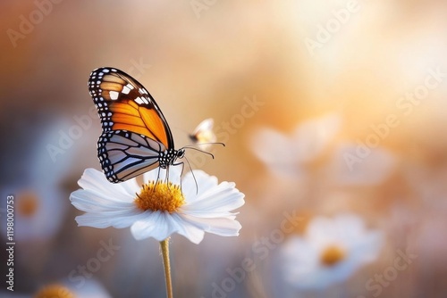 A close-up of a monarch butterfly perched on a colorful wildflower, with a soft-focus meadow in the background