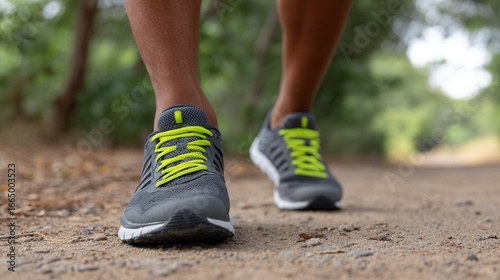 A close-up of a person walking on a dirt trail wearing athletic shoes with bright laces. The setting is natural and serene, ideal for fitness themes.