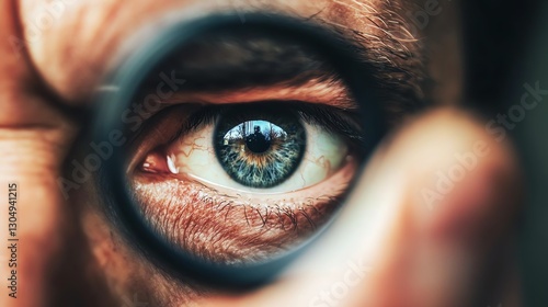 A close-up of a person's eye seen through a magnifying glass, revealing intricate details.