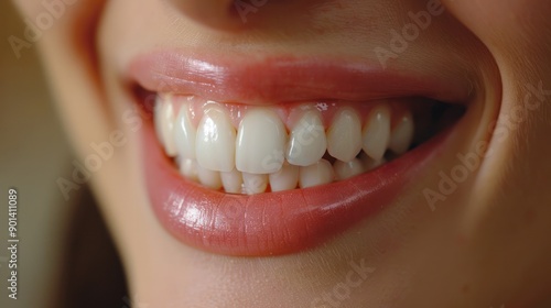 A close-up of a person's smile with bright, healthy teeth, showcasing the results of good dental care