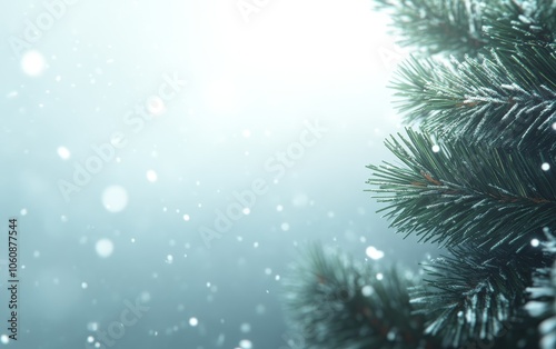 A close-up of a pine tree branch with falling snowflakes, evoking a serene winter atmosphere.