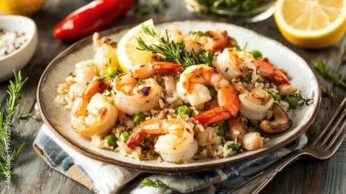 food, dinner, meal, plate, shrimp, seafood, rice, pea, parsley, lemon, vegetable, healthy, dish, cookery, epicure, tasty, delicious, fresh, cooking, kitchen, table, rustic, closeup, macro, detail, background, texture, garnish, ingredient, lunch, breakfast, snack, fork, eatery, diet, nourishment, cook, prepare, favor, eat
