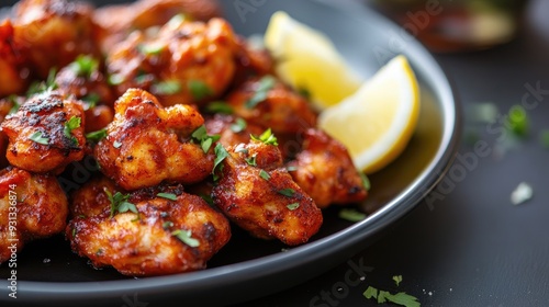 A close-up of a plate of spicy chicken 65 with lemon wedges, leaving space on the side for text
