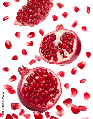 A closeup of a red pomegranate cut in half falling freely vertically on a white background