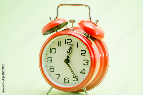 A close-up of a red, vintage alarm clock with black hands and numbers, slightly tilted to the right, against a green background.