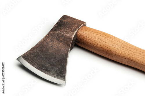 A close-up of a rustic axe featuring a wooden handle and a worn metallic blade.