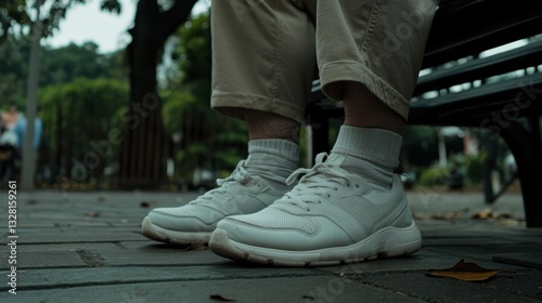A close-up of a senior man's sneakers hints at an active lifestyle, poised for a walk in a park, signifying health and vitality in later years.