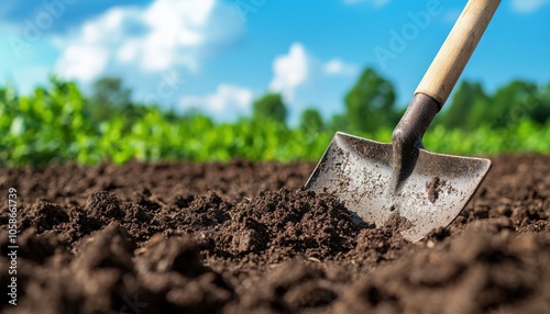 A close-up of a shovel resting on freshly tilled brown soil under a blue sky, indicating preparation for gardening or farming.