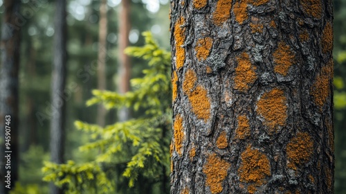 A close-up of a single tree in a forest, with intricate bark patterns and vibrant green moss growing on its trunk.