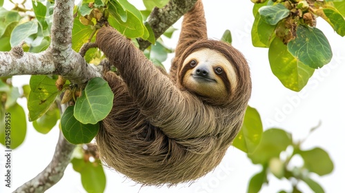 A close-up of a slow-moving sloth hanging from a tree branch, isolated on a white background.