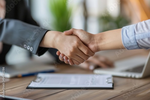 A close-up of a smiling businesswoman shaking hands with a man after signing a contract in an office.