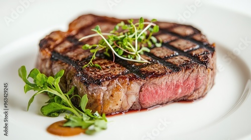A close-up of a steak with a perfect grill mark, garnished with microgreens, and placed on a pristine white plate with a white background.